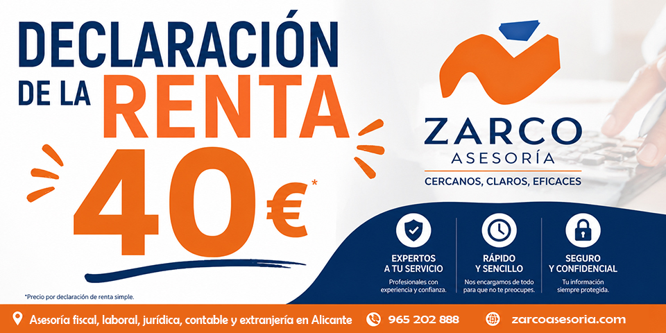 En Zarco Asesoría, tu asesoría fiscal de confianza en Alicante, te ofrecemos un servicio profesional de **Declaración de la Renta por solo 40 €**. Un precio cerrado que incluye revisión completa, optimización de deducciones y presentación telemática segura.